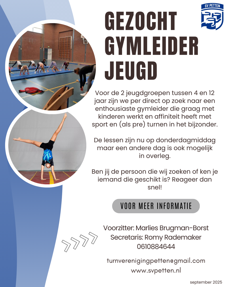 Voor de 2 jeugdgroepen tussen 4 en 12 jaar zijn we per direct op zoek naar een enthousiaste gymleider die graag met kinderen werkt en affiniteit heeft met sport en (als pre) turnen in het bijzonder. De lessen zijn nu op donderdagmiddag maar een andere dag is ook mogelijk in overleg.